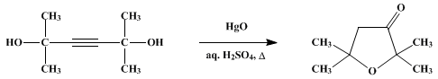 To the solution formed by dissolving 3 g. of mercuric oxide and 10 ml. of concentrated sulfuric acid (Note 1) in 1 l. of water is added 250 g. (1.76 moles) of 2,5-dimethyl-3-hexyne-2,5-diol (Note 2). The mixture is warmed with gentle swirling to dissolve the diol. At 80–90° the clear solution suddenly turns cloudy and the flask is immersed in a bath of water at about 20°. A colorless oil rises to the surface within a few minutes (Note 3).