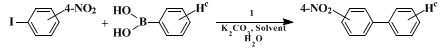 13) Electron withdrawing and electron donating substituents on either the aryl halide or boronic acid have no effect on the ability of the ligandless catalyst to promote this reaction to completion. Aryl bromides undergo coupling as well as aryl iodides, but the required reaction times are longer (2-4 hr). When aryl iodides are used, increased steric hindrance on either substrate also has no detrimental effect on conversion. On aryl bromides, however, increased steric hindrance does hinder quantitative product formation.