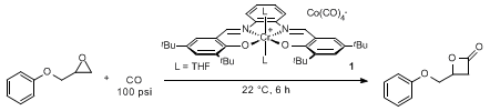 Our initial work focused on epoxide carbonylation at 100 psi CO which allows the use of a glass-sealed reactor, a significantly cheaper and more accessible alternative to a stainless steel reactor. This method worked well under optimized conditions on a 2-mmol scale for a variety of functionally diverse epoxides (Table 1, entries 1-11). In each case, β-lactone is formed as the exclusive product and is isolated from the catalyst in high yield using the method described in the Procedure. Further, the reaction proceeds with retention of stereochemistry (entry 3),