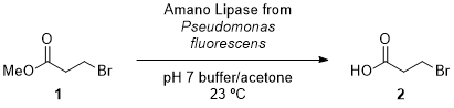 A. 3-Bromopropionic acid (2). A 500-mL Erlenmeyer flask is equipped with a magnetic stir bar (4.6 cm x 0.75 cm, rod shaped). The reaction flask is then charged with methyl 3-bromopropionate (5.00 g, 29.9 mmol, 1.00 equiv) (Note 2) (1) by syringe over 10 seconds (22 G, 7.62 cm needle). The flask containing 1 is then charged with pH 7 buffer (225 mL) (Note 3) and acetone (25 mL) (Note 4) sequentially via graduated cylinder yielding a clear, colorless solution (Figure 1A) (Note 5). The mixture is then stirred at a constant rate of 400 rpm at 23 ℃. Once stirred, the flask is then charged with Amano Lipase from Pseudomonas fluorescens (0.50 g, 10 wt%) (Note 6) yielding a heterogeneous yellow solution (Figure 1B). The flask is then covered with a 7.6 x 7.6 cm square of aluminum foil and allowed to stir at 23 ℃ at a rate of 400 rpm for 14.5 h.