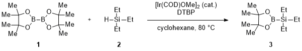 Inside the glovebox, the reaction flask is charged sequentially with bis(pinacolato)diboron (1) (6.00 g, 23.6 mmol, 1.00 equiv) (Note 4), 4,4'-di-tert-butyl-2,2'-dipyridine (DTBP) (127 mg, 473 μmol, 0.020 equiv) (Note 5) and (1,5-cyclooctadiene)(methoxy)iridium(I) dimer ([Ir(COD)OMe]2) (157 mg, 236 μmol, 0.010 equiv) (Note 6). The condenser is fitted to the reaction flask, and secured using a Keck clip. The assembled and septa-sealed glassware is transferred out of the glovebox (Note 7), and into a fume hood (Figure 1B). The septum on top of the reflux condenser is pierced with a needle (18G) that leads to a nitrogen manifold which is connected to a bubbler, allowing for a positive flow of nitrogen gas. The atmosphere is maintained under a slight positive pressure of nitrogen for the duration of the reaction. Under a positive pressure of nitrogen, the Keck clip is removed, and the joint between the flask and condenser is sealed with Teflon tape, then the Keck clip is mounted again. Cyclohexane (39 mL, 0.60 M) is added to the reaction vessel via a plastic syringe fitted with an 18G needle through the rubber septum on the second neck of the flask (Note 8). Triethylsilane (2) (15.1 mL, 94.5 mmol, 4.0 equiv) is added (Figure 1C) via a plastic syringe fitted with an 18G needle through the same septum (Notes 9 and 10). The septum that had been pierced is wrapped with electrical tape. The condenser is attached to hosing connected to a tap and a drain. The water is turned on, and the reaction flask is then placed in an oil bath set to 80 ℃ (Figure 1D) (Note 11). The flask is covered with aluminum foil (Figure 1E) and stirred at 700 rpm for 16 h.