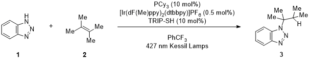 1-(1,1,2-Trimethylpropyl)-1H-benzotriazole (3). A single-necked (14/20 joint) 100-mL Schlenk flask equipped with a Teflon-coated magnetic stir bar (2.0 x 0.8 cm, rod-shaped) was flamed-dried under vacuum, and backfilled with argon (Note 2). The flask was charged with the solid reagents: 1H-benzotriazole (1, 1.79 g, 15.0 mmol, 1.0 equiv) (Note 3), tricyclohexylphosphine (0.48 g, 1.5 mmol, 0.10 equiv) (Note 4), and the [Ir(dF(Me)ppy)2(dtbbpy)]PF6 photocatalyst (0.078 g, 0.078 mmol, 0.05 equiv.) (Note 5) while maintaining a stream of argon to the Schlenk flask (Figure 1A). α,α,α-Trifluorotoluene (35 mL) (Note 6) and tetramethylethylene (2, 3.83 g, 5.40 mL, 45.4 mmol, 3.0 equiv) (Note 7) were added sequentially via a 6 mL syringe equipped with an 18-gauge needle, creating a bright-yellow suspension. 2,4,6-Triisopropylbenzenethiol (354 μL, 0.354 g, 1.5 mmol, 0.10 equiv) (Note 8) was added using a P1000 micropipette, by quickly removing the septum while maintaining a stream of argon. The septum was replaced, sealed, and secured with the aid of electrical tape. The flask was clamped above a stirring plate and positioned between two 427 nm PR160L Kessil lamps at a distance of 2 cm. The reaction was irradiated at 100% intensity with stirring (500 rpm) for 16 h (Figure 1B).