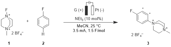 Fluorobenzene DABCOnium (bis)tetrafluoroborate (3). To a 50-mL round-bottomed flask was added a Teflon-coated rod-shaped magnetic stir bar (25.4×8 mm), 3.19 g (10.0 mmol, 1.0 equiv) Selectfluor II (1) by spatula and 1.88 mL (20 mmol, 2.00 equiv.) fluorobenzene (2) by 100-1000 μL micropipette (Notes 5,6,7). MeCN (45 mL, Note 8) was added to the flask using a 100-mL graduated cylinder (Figure 2B) (Note 9). Triethylamine (140 μL, 10 mol%, Note 10) was added to the flask with a 20-200 μL micropipette (Figure 2C). (Note 11). The flask was placed on a stir plate and secured by a clamp.