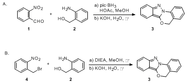 Concurrently, we pursued an alternate route to o-nitrobenzylamine 8. Considering that 8 can also be prepared via N-alkylation, a one-pot protocol to synthesize indazolobenzoxazine 3 from 2-nitrobenzyl bromide (4) and 2-aminobenzyl alcohol (2) was explored. Though this nucleophilic displacement proceeds in methanol, reaction times are quite long (more than 24 h at room temperature). By heating to reflux, the reaction time was decreased to 4 h and the overall yield was increased. Subsequent addition of potassium hydroxide and further heating affords indazolobenzoxazine 3 in 78.8-82.9% yield (Method B). This method, although slightly lower in yield, significantly increases the scope of our methodology by extending the list of possible starting materials to include o-nitrobenzyl bromides. Further, properly modified benzyl alcohols (-OMs, -OTs, -OTf) are also potential starting points for the synthesis of indazolobenzoxazines.