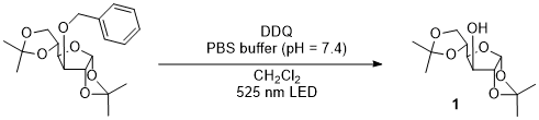 1,2:5,6-Di-O-isopropylidene-α-D-glucofuranose (1). An oven-dried, single-necked side-armed Schlenk tube (250 mL, 23 x 4.5 cm) equipped with a football-shaped Teflon-coated magnetic stir bar (2.5 cm) is charged sequentially with 3-O-benzyl-1,2:5,6-di-O-isopropylidene-α-D-gluco-furanose (4.0 g, 11.4 mmol, 1 equiv) (Note 2) and dichloromethane (200 mL, 57 mM) (Note 3). Under ambient atmosphere, 2,3-dichloro-5,6-dicyano-1,4-benzoquinone (DDQ, 3.12 g, 13.6 mmol, 1.2 equiv) (Note 4) and PBS buffer (0.2 mL, 0.1%vol, pH 7.4) (Note 5) are added, and the flask is sealed with a rubber septum (Figure 1B). The reaction mixture is irradiated using two green LED lamps (525 nm) (Note 6) at full power while stirring at 1400 rpm (Figure 1C).