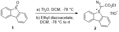 5-(1-Diazo-2-ethoxy-2-oxoethyl) dibenzo[b,d]thiophenium triflate (2). An oven dried, 500 mL, three-necked, round-bottomed flask (14/23, 29/32, 14/23 ground glass joints), equipped with a Teflon-coated magnetic stir bar (3.5 x 1.0 cm, egg-shaped), is charged with dibenzo[b,d]thiophene 5-oxide (1) (6.0 g, 30 mmol, 1.0 equiv) (Note 2). The flask is fitted with a vacuum adapter (14/23 ground glass joint), while the other two necks are stoppered with new rubber septa. The flask is evacuated (<1 mmHg) and refilled with nitrogen three times. Subsequently, under flow of N2 a low temperature glass thermometer is fitted in the second 14/23 glass joint. Dry dichloromethane (300 mL) (Note 3) is added via cannula through the rubber septum (Figure 1A), and the clear solution is cooled to -78 ℃ (internal temperature) using a cryocooler and an acetone bath (Figure 1B). Triflic acid anhydride (5.0 mL, 30. mmol, 1.0 equiv) is then dropwise added over 30 min by syringe pump, causing an intense red suspension to form (Figure 1C) (Note 4). The reaction mixture is stirred for 1 h at that temperature at which time a solution of ethyl diazoacetate (4.0 mL, 33 mmol, 1.1 equiv) (Note 5) in dry dichloromethane (30 mL) is added to the reaction mixture over 30 min by syringe pump. The clear solution is stirred for an additional hour at -78 ℃ (Figure1D), and then the acetone bath is removed (Figure 1E) and the flask is allowed to warm to ambient temperature over the course of 1 h. The dark orange/red color disappears, and a light brown suspension is formed (Figure 1F).