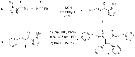 R)-TRIP-catalyzed reaction. Furthermore, the synthesis of the cinnamoyl-imidazole (1) involves a high-yielding aldol condensation from a commercially available methyl ketone. Finally, the key asymmetric [2+2] photocycloaddition and the cleavage of the imidazole auxillary can be conducted without chromatographic purification of the intermediate cycloadduct.