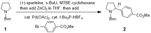 A. tert-Butyl (S)-2-(4-(methoxycarbonyl)phenyl)pyrrolidine-1-carboxylate. An oven dried 500 mL three-necked round-bottomed flask is attached to a Schlenk line with N2 as inert gas and equipped with a temperature probe, a Teflon-coated magnetic stir bar (2 x 0.8 cm), and a rubber septa. The flask is then degassed with nitrogen via five evacuate-refill cycles. MTBE (120 mL), N-Boc-pyrrolidine (1) (10.0 g, 58.4 mmol, 1.20 equiv), and (+)-sparteine (13.7 g, 58.4 mmol, 1.20 equiv) are charged into the flask, and the solution is cooled to between -70 °C to -78 °C over 30 min with a dry ice/acetone bath (Note 2). 1.4 M sec-BuLi in cyclohexane (45.2 mL, 63.3 mmol, 1.30 equiv) is then added dropwise over 30 minutes via syringe into the yellow solution while maintaining the internal temperature below -65 °C (Note 3). The resulting orange-red solution is aged at -65 °C to -78 °C for 3 h (Figure 1 and Note 4). A 0.7 M solution of ZnCl2 in THF (97.3 mL, 68.1 mmol, 1.40 equiv) is then added dropwise over 60 min via a syringe while the internal temperature is kept below -65 °C (Note 5). Once the addition is complete, the dry ice/acetone bath is removed and exchanged for a water bath at ~25 °C (Figure 2). As the internal temperature rises, the slurry becomes yellow. After reaching room temperature (~25 °C), the reaction is aged for an additional 45 min, and the slurry thins into a hazy yellow solution.