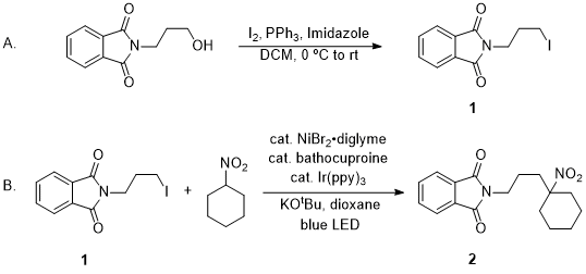 In the reported example here, the nickel pre-catalyst is formed in situ by simply mixing commercially available reagents, NiBr2·diglyme and bathocuproine. However, this complex can also be isolated and used as an air-stable and non-hygroscopic solid (see notes). The alkyl iodides can be synthesized in high yields from the corresponding alcohols using a variety of well-known reactions. In this case, we used the Appel reaction, which provided the primary alkyl iodide (1) in excellent yields. The resulting nickel pre-catalyst, and 1° and 2° alkyl iodides are stable indefinitely at -20 ℃. The Ni/Ir dual-catalyzed reaction of a typical 2° nitroalkane, nitrocyclohexane, with the primary alkyl iodide (1), affords the sterically congested 3° nitroalkane product (2) in good yields. We should also emphasize that all the reactions were set up on the bench under air with no caution for oxygen and moisture exclusion. The only precaution that is required, at least in our hands, is to ensure that the reactor is sealed prior to irradiation and that the headspace in the reactor is not large (we assume that under these conditions, ambient oxygen is consumed in a photoredox reaction, perhaps with the solvent, prior to the initiation of the alkylation reaction, but we have been unable to verify this hypothesis). This is further advantageous as only common glassware and equipment found in most organic and medicinal labs are sufficient.