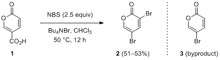 3,5-Dibromo-2-pyrone (2). A 200-mL two-necked round-bottomed flask, equipped with a 4.5-cm Teflon-coated magnetic stir bar and a reflux condenser, is sequentially charged with N-bromosuccinimide (15.8 g, 88.9 mmol, 2.5 equiv) (Note 1), tetrabutylammonium bromide (571 mg, 1.77 mmol, 0.05 equiv) (Note 2), and chloroform (50 mL) (Note 3). Coumalic acid (1) (5.00 g, 35.7 mmol) (Notes 4 and 5) is added to the stirring solution, which is heated by using an oil bath at 50 °C for 12 h (Note 6). After cooling to rt, hexane (100 mL) is added. The resultant two-phase mixture becomes one-phase after vigorous stirring. To remove the succinimide byproduct, the resulting mixture is filtered through a short plug of silica gel (50 g) eluting with 1400 mL of 1:1 dichloromethane-hexane, until TLC analysis shows that the product 2 is no longer detected in the eluent (Note 7). The filtrate is concentrated with a rotary evaporator (30 °C, 100 mmHg) (Note 8), and the resulting crude oil is purified by flash silica-gel column chromatography, eluting with hexane-dichloromethane (3:2) (Note 9). The combined eluents are concentrated with a rotary evaporator (30 °C, 100 mmHg) and further evaporated with an oil vacuum pump at room temperature to afford 3,5-dibromo-2-pyrone (2, 4.66-4.73 g, 51-53%) as a pale yellow solid (Note 10).