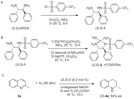 [IrOTf(Cp*)((S,S)-N-4-(Trifluoromethyl)benzenesulfonylated-DPEN)] ((S,S)-2). An oven-dried 50-mL round-bottomed flask is equipped with an octagonal magnetic stir bar (6 mm x 25 mm) and a rubber septum fitted with an argon inlet needle. The flask is flushed with argon and charged with