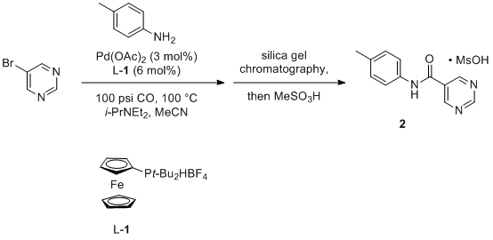 Pyrimidine-5-carboxylic acid p-tolylamide methanesulfonate (2). A 475 mL Parr vessel containing a cylindrical Teflon-coated magnetic stir bar (5 cm in length, 1 cm in diameter) is charged with