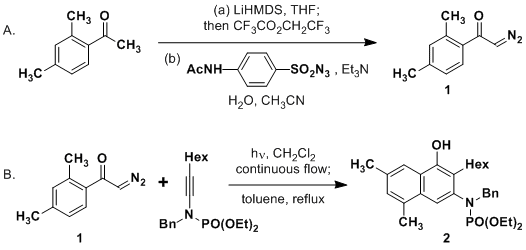 Table 2 summarizes the results of our optimization experiments. As expected, faster flow rates (shorter residence times) result in the recovery of larger amounts of unreacted diazo ketone. For our optimal procedure, we chose to employ 1.2 equiv of diazo ketone which allows for efficient reaction even with residence times on the order of 10 min. This residence time corresponds to an excellent throughput of 10.5 mmol/h for the "preparative scale" photochemical flow reactor employed in the procedure described in this article. It should be noted, however, that if desired, the benzannulation can be carried out in comparable overall yield using only 1.05 equiv of diazo ketone simply by increasing the residence time as indicated in Table 2.