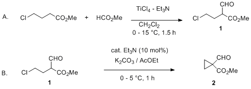 The present α-formylation reaction of methyl 4-chlorobutanoate (1) is a distinctive example of the compatibility with a base-sensitive γ-chloro group. Synthesis of 2 is not possible using the base-mediated α-formylation method due to undesirable and predominant cyclopropane formation leading to methyl cyclopropanecarboxylate.