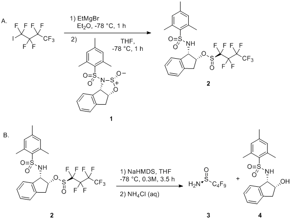 11 The two-step synthesis of perfluorobutanesulfinamide from Senanayakes’s 2-aminoindanol-derived sulfinyl transfer reagent described in this report proceeds in good overall yield and with excellent enantiomeric purity. The described method uses inexpensive nonafluoro-1-iodobutane as a starting input and requires only one straightforward flash column chromatography. Additionally, the chiral auxiliary