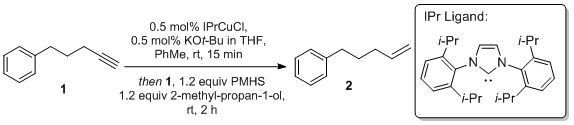 12a several additional developments have been made using NHC-Cu catalysts in the semi-reduction of alkynes. A variation using a Cu(OAc)