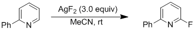 Silver (II) fluoride handled and stored this way was used reproducibly in the title reaction on various scales over the course of 2-3 weeks. Notable discoloration of the black solid to a yellow/brown solid occurs after prolonged handling in air, at which time the reagent should be discarded.
