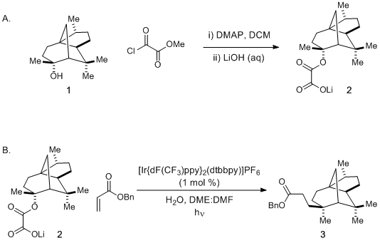 In the example detailed here, a commercially available, sterically congested tertiary alcohol, cedrol 1, is coupled to a prototypical Michael acceptor, benzyl acrylate, to illustrate the efficiency and diastereoselective nature of the reaction in a complex setting. The resulting product is obtained as a single epimer at the newly formed quaternary carbon stereocenter in good yield using nearly equimolar amounts of the two coupling partners. The conditions reported are general and expected to be similarly efficient for a wide scope of coupling partners.