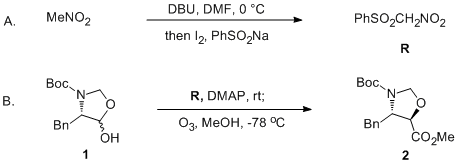 Figure 3 shows the TLC plates with spots of the starting material 1, the product 2, the conjugate addition intermediate adduct IV (R1=Bn, see Scheme 2) and the reagent (PhSO2CH2NO2, represented as R on TLC plates). Each spot is visualized with a ninhydrin solution (left) and UV light (254 nm) (right). The following Rf values are calculated with the stained spots by ninhydrin (hexane:EtOAc 2:1 (v/v)): Rf of 1 = 0.39; Rf of 2 = 0.55; Rf of IV (R1=Bn) = 0.42; Rf of R = 0.45.