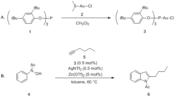 N -arylhydroxylamine onto a terminal aliphatic alkyne in the presence of a gold catalyst, followed by one-pot sequential 3,3-rearrangement and dehydrative cyclization reaction. Despite the exceptionally mild reaction conditions (ambient temperature), the utility of this chemistry is largely limited by the moderate thermostability of the