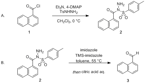 N-(1-Naphthoyl)-4-methylbenzenesulfonohydrazide (2). An oven-dried 1-L, three-necked round-bottomed flask is equipped with an internal thermometer, a rubber septum, argon gas inlet adaptor, a 50 mL dropping funnel, and a 3.0-cm rod-shape, Teflon-coated, magnetic stir bar. The flask is evacuated and refilled with argon twice, then charged with