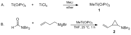in situ generated from organomagnesium (Grignard) as well as organozinc reagents in the presence of stoichiometric or substoichiometric (semi-catalytic) quantities of a titanium alkoxide derivative of type XTi(OR)