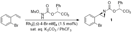 Rh2{(S)-4-Br-nttl}4. The scope of the aziridination reaction includes styrene derivatives containing diversely functionalized aromatic ring as well as β-methylstyrene (eq 1).