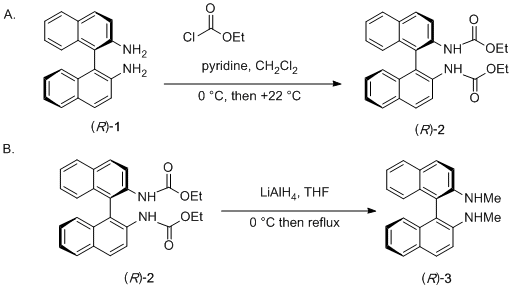 (1R)-[1,1'-Binaphthalene]-2,2'-diylbiscarbamic acid diethyl ester ((R)-2). A 500-mL, round-bottomed, two-necked flask (24/40 joints) containing a 16 x 37 mm Teflon-coated, ellipsoid-shaped magnetic stirring bar is fitted with a rubber septum on one neck through which is inserted a thermocouple probe and with a gas inlet adapter on the other neck. The flask is flame-dried under vacuum, refilled with