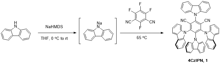 1) can be recrystallized. The solid can be taken up in a minimum amount of hot dichloromethane (until complete dissolution). After cooling to room temperature, a few drops of MeOH (~0.1 mL per milliliter dichloromethane) are added and the mixture is placed in a -20 °C freezer. The resulting crystals can be collected by filtration and washed with pentane (Submitters). Checkers omitted this process because the purity of the 4CzIPN (