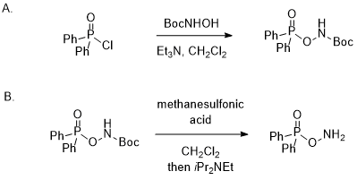 A. tert-Butyl (diphenylphosphoryl)oxycarbamate. Into a clean and dry 1-L 3- necked flask containing a magnetic stir bar (1.25 in egg-shaped) tert-butyl-N-hydroxycarbamate (30.9 g, 232 mmol, 1.10 equiv) is added in one portion along with dichloromethane (200 mL) (Note 2) in one portion. Once the charging is completed, the middle neck of the flask is fitted with a 125-mL addition funnel and a nitrogen inlet, followed by placing a temperature probe on the second neck and a septum on the third neck of the flask. After connecting the set-up to a nitrogen inlet, stirring of 200 rpm is initiated, and the contents of the reactor are cooled between -5 °C and -15 °C (internal temperature) using a bath consisting of ice and acetone (Note 3). After about 15 min the solids are completely dissolved, and triethylamine (37 mL, 264 mmol, 1.25 equiv) (Note 2) is added dropwise over 10 min (Note 4). In a separate 250-mL one-necked flask equipped with a septum and a needle to allow a nitrogen atmosphere, diphenylphosphinic chloride (40.4 mL, 50.0 g, 211 mmol, 1 equiv) (Note 2) is mixed in dichloromethane (50 mL) under nitrogen using gentle shaking for about 1 min. The dichloromethane solution of diphenylphosphinic chloride is then transferred to the 125-mL addition funnel using a canula, and the phosphinic chloride solution is added dropwise to the pre-cooled solution of the hydroxylamine using a high nitrogen sweep over 30 min in order to keep the internal temperature below 0 ºC (Note 5). After the reaction completion is determined by 1H NMR (Note 6), the organic phase is warmed above 10 °C by a warm water bath, and the addition funnel is used again to add 5% aqueous citric acid solution (100 mL) over 5 min. After 15 min of stirring, the contents of the reactor are transferred to a 1-L separatory funnel, and the aqueous layer is discarded (Note 7). After the wash, the organic solution is transferred into a 1-L one-necked flask and concentrated on a rotary evaporator setting the vacuum between 225 and 300 mmHg with a bath temperature above 35 ºC until approximately 100-125 mL of total volume remains, at which point the product starts to precipitate spontaneously. To this slurry, hexane (125 mL) (Note 2) is added and concentrated on the rotary evaporator until approximately 100-125 mL remains, at which point another portion of hexanes (125 mL) is added and concentrated to approximately 100-125 mL total volume (Note 8). The resulting slurry is stirred for 12 h at room temperature (Note 9). The solids are collected on a 500-mL sintered glass Büchner funnel with paper filter, and washed with 4:1 hexane:dichloro-methane mixture (250 mL) (Note 10). After drying on the frit using 3-4 mmHg vacuum at room temperature, tert-butyl (diphenylphosphoryl)-oxycarbamate (67.0 g, 201 mmol, 95%) is isolated as a white solid (Notes 11, 12, 13, and 14).