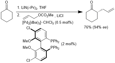 S)- 2-allylcyclohexanone had been chosen for demonstrating that preformed, non-stabilized lithium enolates are suitable nucleophiles for palladium-catalyzed asymmetric allylic alkylations - the so-called Tsuji-Trost reaction.