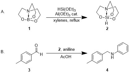 A. 1-Hydrosilatrane (2). A 1-L, three-necked (24/40 joints), round-bottomed flask containing a 5.0 cm x 0.5 cm Teflon-coated magnetic stir bar, is fitted with a reflux condenser. A rubber septum is attached to the top of the reflux condenser with a nitrogen inlet and an outlet needle, and a 24/40 glass stopper is attached to the side necks of the 1-L round-bottomed flask. The entire apparatus is flame-dried and, after removing the outlet needle, is allowed to cool to 23 °C under a flow of N2. The glass stoppers are switched to rubber septa at this stage. The round-bottomed flask is charged in one portion with boratrane (6.28 g, 40 mmol, 1.0 equiv) (Note 2) through the side neck under a nitrogen flow. Then, using a 500-mL graduated cylinder, xylenes (400 mL) (Note 2) is added in one portion through the side neck. Then, using a 20-mL plastic syringe, triethoxysilane (11.1 mL, 60 mmol, 1.5 equiv) (Notes 2 and 3) is added in one portion through the septum. Finally, aluminum ethoxide (0.12 g, 0.76 mmol, 0.019 equiv) (Note 2) is added in one portion through the side neck. The aluminum ethoxide turns into a black suspension, but the reaction mixture homogenizes within an hour. Cold water is run through the condenser and the apparatus is lowered into a silicone oil bath (Note 4) pre-heated to 177 °C on a hot plate equipped with a temperature probe (Figure 1).