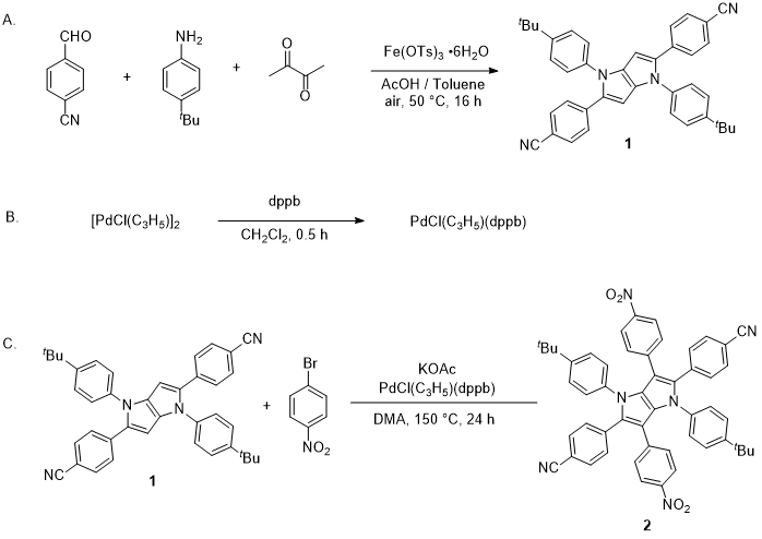 C. 1,4-Bis(4-(tert-butyl)phenyl)-2,5-bis(4-cyanophenyl)-3,6-bis(4-nitro-phenyl)-1,4-dihydropyrrolo[3,2-b]pyrrole (2). A three-necked, 500 mL round-bottomed flask (main neck 29/32 joint, side neck 15/25 joint) (flask A) is equipped with a 5 cm Teflon-coated football shaped magnetic stir bar. A 29/32 three-way stop cock is attached to the main neck of the flask and sealed with Teflon tape. The flask is connected to an argon/vacuum line and the reaction setup is dried under vacuum (4.8 mmHg) by heating with a heat gun and allowed to cool to room temperature. Next, the reaction set-up is backfilled with argon and the flask is charged with 1 (5.73 g, 10.0 mmol, 1 equiv), 1-bromo-4-nitrobenzene (12.1 g, 60.0 mmol, 6 equiv) (Note 22), PdCl(C3H5)(dppb) (0.60 g, 0.98 mmol, 10 mol%) and potassium acetate (5.30 g, 54.0 mmol, 5.4 equiv) (Note 23) while purging the flask with argon. The reaction set-up is evacuated and backfilled with argon three times and sealed with a rubber septum. Dry N,N-dimethylacetamide (DMA, 250 mL) (Note 24) is added to flask A via a cannula from a three-necked, 500 mL round-bottomed flask equipped with a three-way stopcock and sealed with rubber septa and Teflon tape) (flask B) with the constant argon flow (Figure 6A). The three-way stopcock of the flask A is closed after solvent addition. The cannula is removed and the flask A is immersed in the silicone oil bath preheated to 150 °C (Note 25).