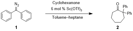 To the flask is added toluene (32 mL to generate a 1.1 M solution) (Note 6) by a syringe through the rubber septum on the side neck. After suspending the catalyst in toluene (Figure 2B), 4.20 mL of cyclohexanone (3.98 g, 40.6 mmol, 1.13 equiv) (Note 7) is added by a syringe through the same rubber septum. The reaction mixture immediately turns from a white suspension to a pale yellow, homogeneous solution (Figure 2C). Then, the rubber septum on the top of the pressure-equalizing addition funnel is removed. In a separate single-necked 100-mL round-bottomed flask, 7.00 g of bright red diphenyldiazomethane (1, 36.0 mmol, 1.00 equiv) (Note 8) is dissolved in heptane (40 mL to generate a 0.90 M solution) (Note 9) at 0 °C, and the solution is transferred to the pressure-equalizing addition funnel using a 10-mL glass pipette. The rubber septum is reattached on the top of the funnel and sealed with Teflon tape. The solution inside the addition funnel, which is continuously cooled to 0 °C (Note 5) and shielded from light by aluminum foil, is added dropwise to the reaction mixture over 3 h at 24 °C (Notes 10 and 11) (Figure 3A). After the complete addition of the diazoalkane, the solution is allowed to stir for 3 h. The reaction mixture is light yellow in color but contains a brown, oily precipitate comprised of deactivated Sc(III) salts (Note 12) (Figure 3B).
