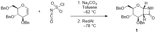 A. (1S,3R,4S,5R,6R)-4,5-Bis(phenylmethoxy)-3-[(phenylmethoxy)methyl]-2-oxa-8-azabicyclo[4.2.0]octan-7-one (1). An oven-dried 500 mL three-necked round-bottomed flask is equipped with an oven-dried 3 cm Teflon-coated magnetic stir bar and oven-dried sodium carbonate (4.00 g, 37.7 mmol, 1.6 equiv) (Note 2). The right neck is fitted with an oven-dried 15/25 glass stopper (Note 3). The left neck is fitted with a 15/25 rubber septum, and the central neck is equipped with a 29/32 three-way cock connected to an argon inlet and a vacuum line. The flask is evacuated and backfilled with argon gas three times. Argon atmosphere is maintained throughout the reaction under argon flow (Figure 1A). Anhydrous toluene (40 mL) (Note 4) and chlorosulfonyl isocyanate (CSI) (2.72 mL, 4.42 g, 31.2 mmol, 1.3 equiv) (Notes 5 and 6) are added at room temperature (26 °C) to the 500 mL three-necked round-bottom flask using 60 mL and 6 mL disposable syringes, respectively. The reaction flask is cooled to -78 °C (bath temperature) in a dry ice and methanol bath within a 1 L Dewar cooling bath (Note 7).