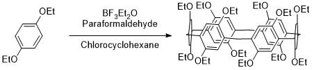 Ethoxypillar[6]arene. An oven-dried 2000 mL three-necked round-bottomed flask is equipped with an overhead stirrer (IKA Rw 20 digital) and an argon inlet, the third neck is left unequipped. The vessel is flushed with argon for 10 min (Note 2). 1,4-Diethoxybenzene (40.00 g, 1.0 equiv, 0.24 mol) (Note 3) and paraformaldehyde (14.38 g, 2.0 equiv, 0.48 mol) (Note 4) are charged in the reaction vessel. The solids are agitated at 410 rpm for 5 min under a flow of argon (Figure 1A). Under argon flow, chlorocyclohexane (1.0 L) (Note 5) is added to the reaction vessel through the open inlet. The resulting white cloudy suspension is mixed for 10 min (Figure 1B). The flow of argon is reduced, and a rubber septum is placed on the open neck. While stirring, BF3•Et2O (40 mL, 1.3 equiv, 0.32 mol) (Note 6) is added via syringe (6-inch, 18-gauge stainless steel needle, 50 mL disposal syringe) in a continuous stream (addition time less than 1 min). After approximately 1 min the white cloudy suspension changed to a green suspension with white precipitate (Figure 1C). After approximately 2 min, the suspension changed to a dark green-black suspension (Figure 1D). A small exotherm from 22 °C to 35 °C is observed. The reaction mixture is allowed to cool while stirring for 1.5 h.