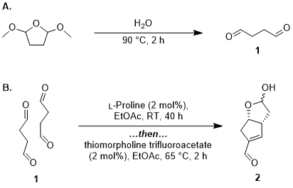 B. (3aR,6aS)-2-Hydroxy-3,3a,6,6a-tetrahydro-2H-cyclopenta[b]furan-5-carbaldehyde (2). To a 2 L round-bottomed flask equipped with a 4.0 cm magnetic stirrer bar is added freshly distilled succinaldehyde (25.0 g, 0.290 mol, 1.00 equiv) and EtOAc (390 mL, 0.75 m) (Note 14). The solution is briefly stirred (800 rpm, 30 sec) to ensure full dissolution of succinaldehyde and formation of a homogenous solution (Note 15). To the rapidly stirring solution is added 1,3,5-trimethoxybenzene (1.22 g, 7.25 mmol, 2.50 mol%) as an internal standard, followed by l-Proline (669 mg, 5.81 mmol, 2.00 mol%). The reaction mixture is stirred (800 rpm) at room temperature for 40 h (Figure 4) (Note 16).