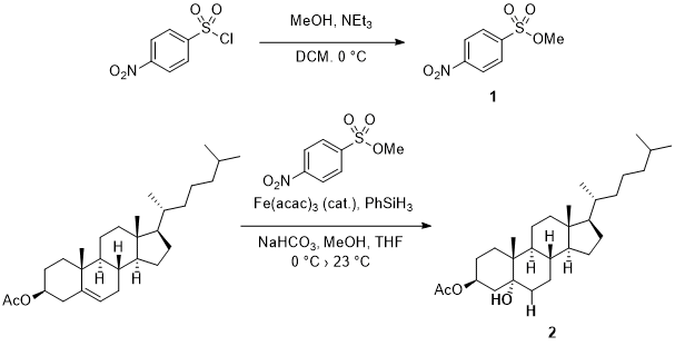 B. 3β-Acetoxy-5α-cholestan-5-ol (2). An oven-dried 500-mL 3-neck flask (2 x NS 14/23, 1 x NS 29/32) is equipped with a Teflon-coated stirring bar (3 cm x 0.5 cm), a small and large septum and NS 14/23 glass-vacuum adapter (Figure 5 A). The flask is evacuated in vacuum until it reaches room temperature and then backfilled with argon (Note 16). The flask is charged with Fe(acac)3 (177 mg, 0.500 mmol, 0.025 equiv) (Note 17), cholesteryl acetate (8.57 g, 20.0 mmol, 1.0 equiv) (Note 18), methyl 4-nitrobenzenesulfonate (5.65 g, 26.0 mmol, 1.3 equiv) and NaHCO3 (3.36 g, 40.0 mmol, 2.0 equiv) (Note 19). The flask is evacuated and backfilled with argon once more time and dry methanol (80 mL) followed by dry THF (80 mL) (Note 20) (Note 21) are added (Figure 5 B). The red mixture is cooled to 0 ℃ with an ice bath and the small septum is exchanged for a quick-fit adapter fitted with a thermometer (Figure 5 C).