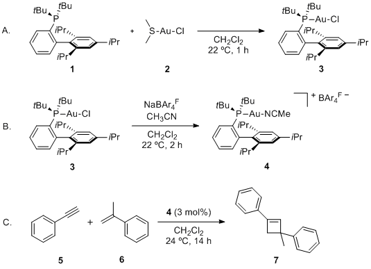 (Acetonitrile)[(2 ́,4 ́,6 ́-triisopropyl-1,1 ́-biphenyl-2-yl)di-tert-butylphos-phine]gold(I) tetrakis[3,5-bis(trifluoromethyl)phenyl] borate (4). A one-necked (B29, diameter: 3.5 cm) 100-mL round-bottomed flask open to air, equipped with a Teflon-coated egg-shaped magnetic stirring bar (19 × 10 mm) is charged with gold(I) chloride complex